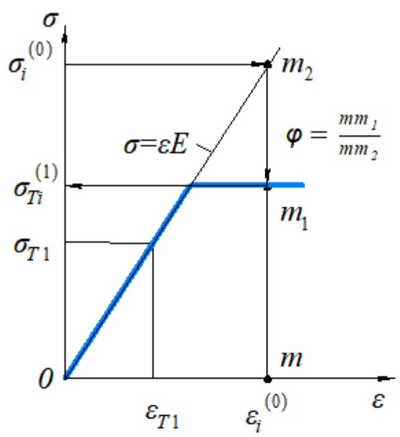 Пояснение. Материал приповерхностных полосок считается идеальным упруго-пластическим. Если напряжение нулевого приближения в полоске не превышает напряжение пластического течения в ней, то для полоски редукционный коэффициент принимается равным единице. Для других приповерхностных полосок редукционный коэффициент назначается в соответствии со схемой рис. 4.