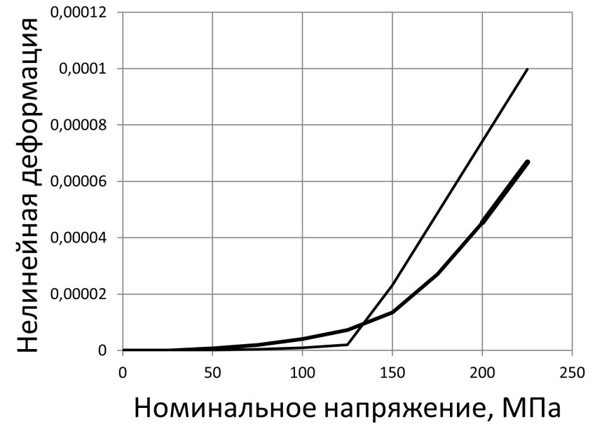 Рис. 5. Нелинейная деформация на поверхности образца в зависимости от номинального напряжения. Жирная линия — изгиб, тонкая линия — растяжение