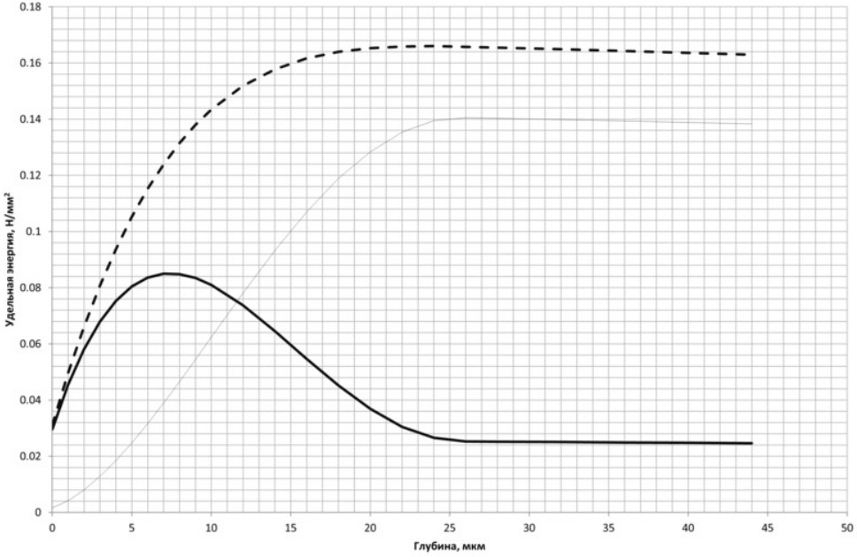 Рис. 6. Изменение энергий деформирования в приповерхностных слоях при изгибе образца: жирная линия — энергия пластического деформирования; тонкая линия — энергия упругого деформирования; пунктирная линия — полная энергия