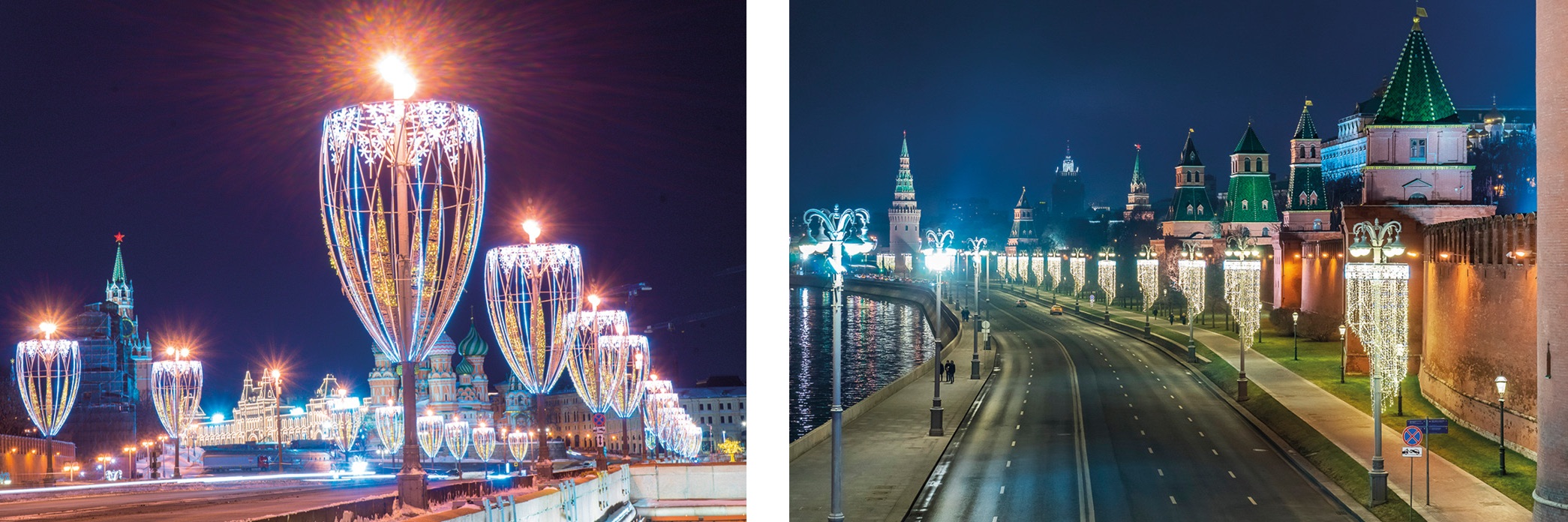 В 2017 г. московские власти приняли решение фундаментально проработать эстетику единой светоцветовой среды. Были отобраны магистрали, подчеркивающие структурные особенности города, которые нужно было выделить средствами светового дизайна. На этих «направляющих» светового каркаса монтировались авторские декоративные световые изделия, специально придуманные для Москвы. Вытянутая в пространстве композиция создавала у того, кто едет по дороге, иллюзию плавного перетекания одной формы в другую. В изделиях в виде фужеров с пузырящимся шампанским движущиеся вверх «пузыри» придавали легкость всей форме, которая в действительности была весьма внушительной: высота фужера составляла 6 м, а диаметр – 3 м. Набережные декорировались конструкциями в виде люстр со струящимися вниз подвесками в стиле люстр Большого Кремлевского дворца.