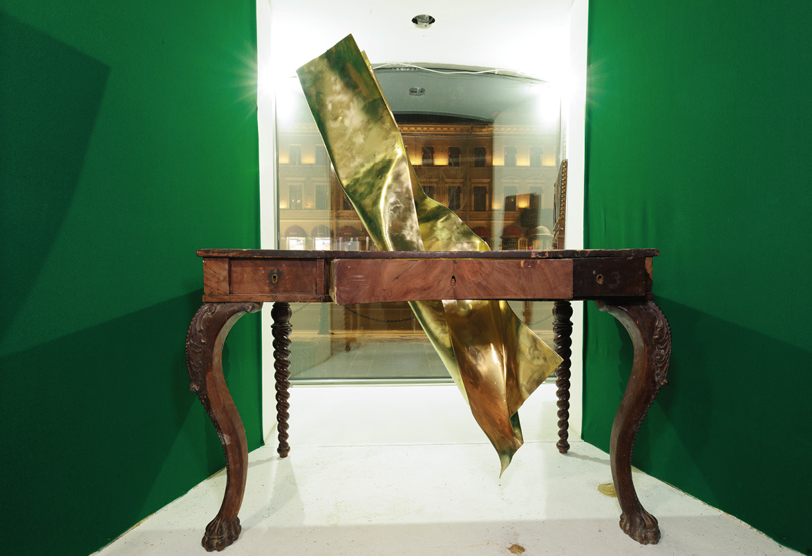 С марта по июнь 2022 г. на «Невском, 19» был выставлен художественный проект автора статьи «Департамент согласований» [4]. Цель, форма и содержание данной экспозиции затрагивают несколько понятийных полей. Отчасти она является персональной выставкой, отчасти – музейной интерпретацией. С одной стороны, идея соединить историческую мебель со скульптурой, металлом, камнями была интересна как художественный эксперимент. С другой – новое помещение ГМГС и необходимость познакомить публику с коллекцией требовали найти повод и концептуальное содержание. В фондах (помимо указанных монументов, мемориальных досок и графических листов) хранятся проекты несостоявшихся памятников, а специалисты изучают длительные процессы установки того или иного памятного знака. Эта «скрытая» история также нуждается в особом представлении зрителю.