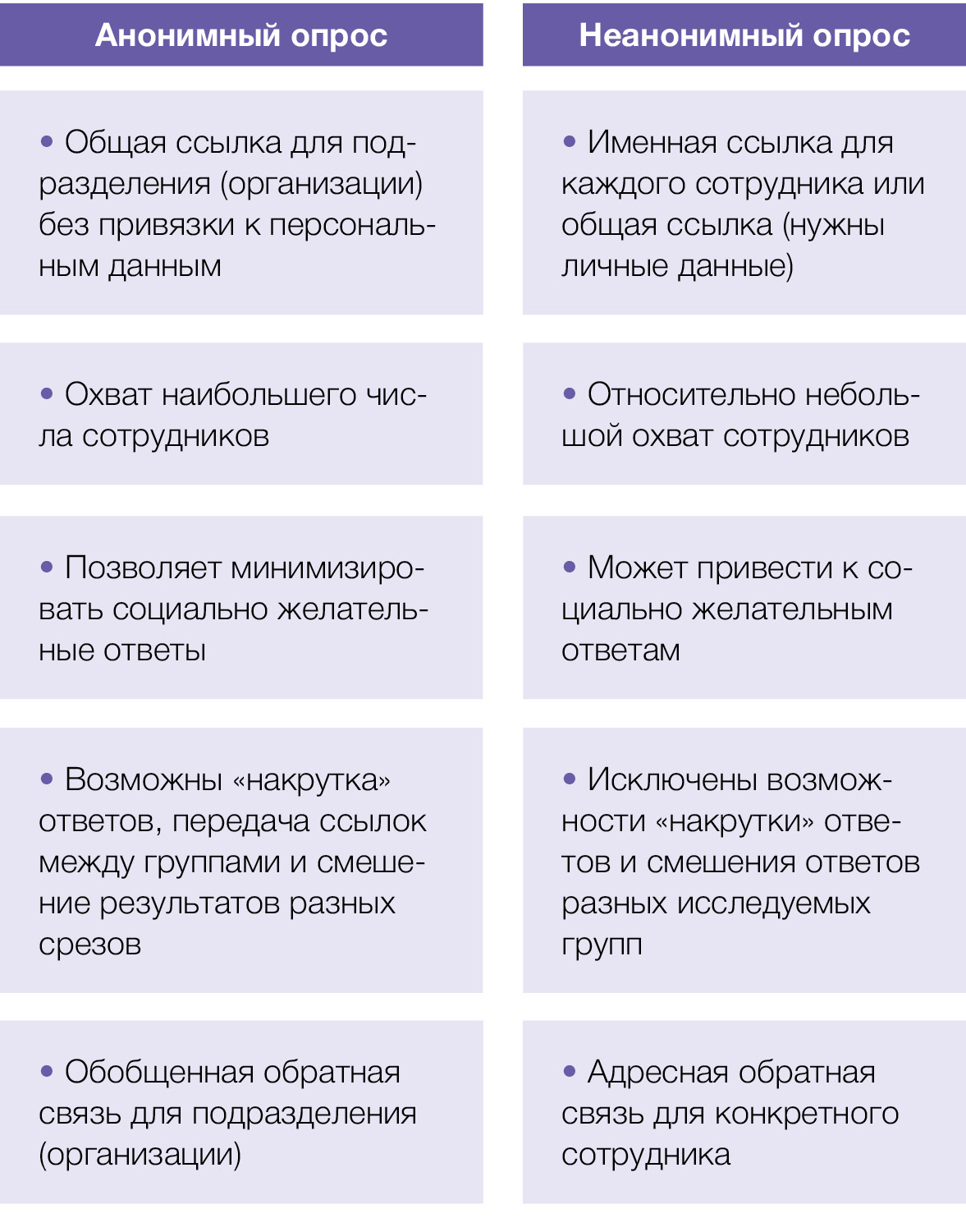 Первый этап – подготовка. Здесь важно определить цели, целевую аудиторию, количество и содержание вопросов в анкете, выбрать ключевые «настройки» опроса. Одна из таких «настроек» – анонимность. Используемая «Кадровыми сервисами Правительства Москвы» система позволяет собирать ответы сотрудников как анонимно, так и с указанием персональных данных. Нельзя утверждать, что в любой ситуации лучшим вариантом будет анонимный или, наоборот, неанонимный опрос. При выборе необходимо взвесить все возможности и ограничения обоих вариантов (рис. 1). На практике используется также вариант частично анонимного опроса, когда персональные данные респондента не запрашиваются, но исследователь знает такие его характеристики, как подразделение, пол, стаж, возраст, уровень должности.