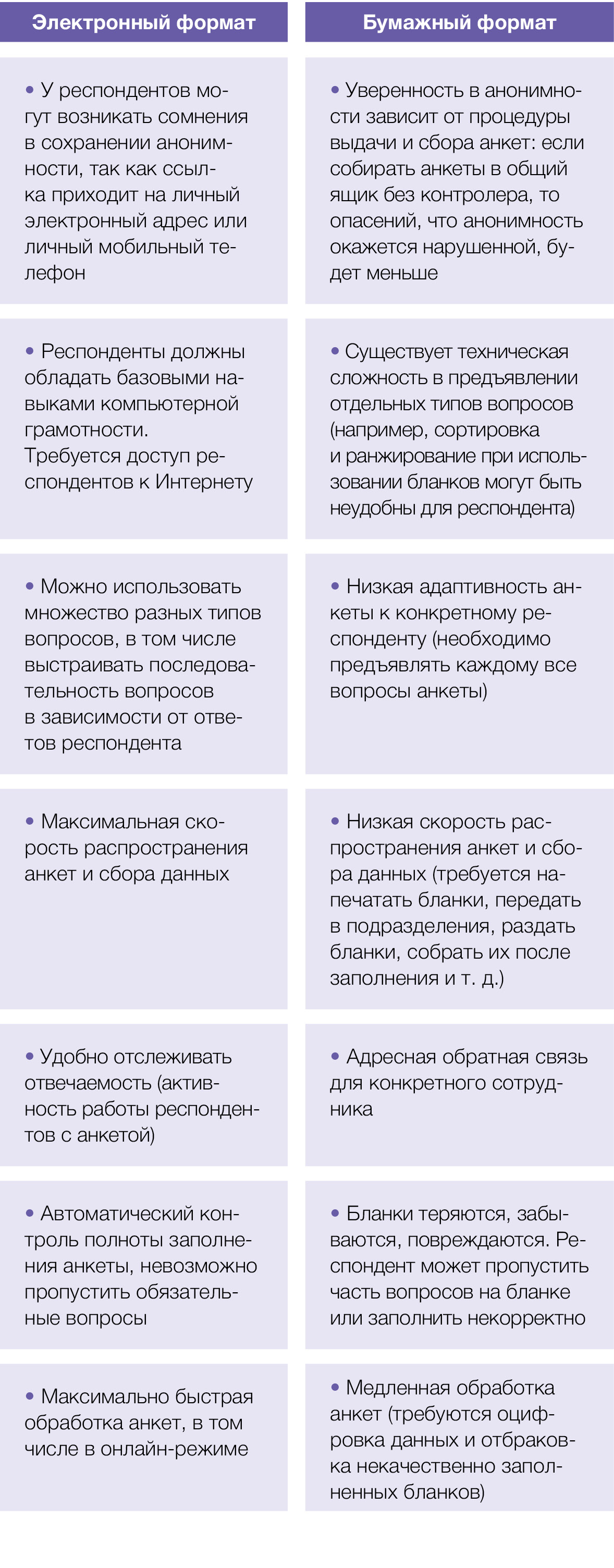 На этапе подготовки опроса нужно уточнить, в какой форме его проводить – электронной или бумажной. Несмотря на кажущуюся архаичность второго метода, для некоторых сотрудников, неуверенно владеющих компьютером или смартфоном, анкеты, напечатанные на бумаге, являются наиболее подходящим способом высказаться. Следует при этом учитывать, что потребуется дополнительное время на подготовку и обработку результатов (рис. 2).