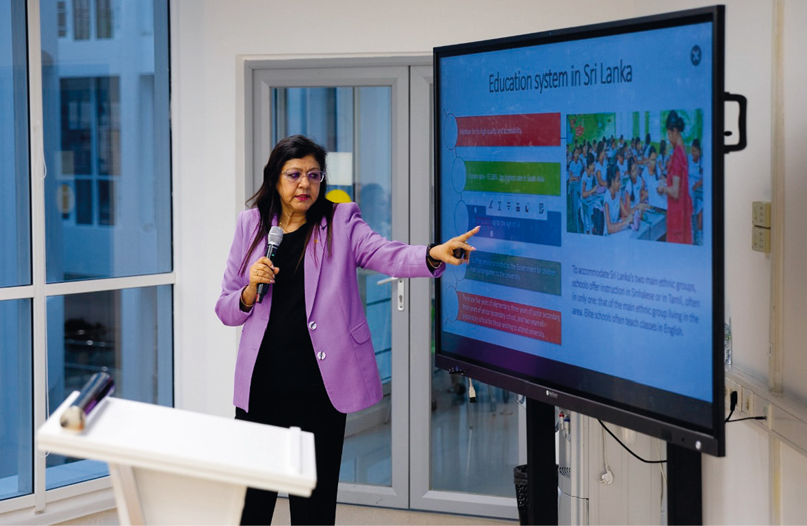 На встрече госпожа посол поделилась проблематикой и практиками не только как официальный представитель государства, но и как бывший руководитель в сфере образования – ректор Университета народной медицины Гампаха Викрамараччи. Хотя уровень грамотности в Шри-Ланке выше, чем во многих других южноазиатских странах (в 2020 г. он составил 92,38%), многочисленные кризисы и пандемия COVID-19 оказали серьезное влияние на систему образования. Несмотря на все сложности, образование в Шри-Ланке бюджетное на всех уровнях, включая университетский. На острове расположено примерно 11 тыс. школ, где обучается порядка 4 млн школьников, а соотношение учеников и учителей составляет 16,8 к 1.