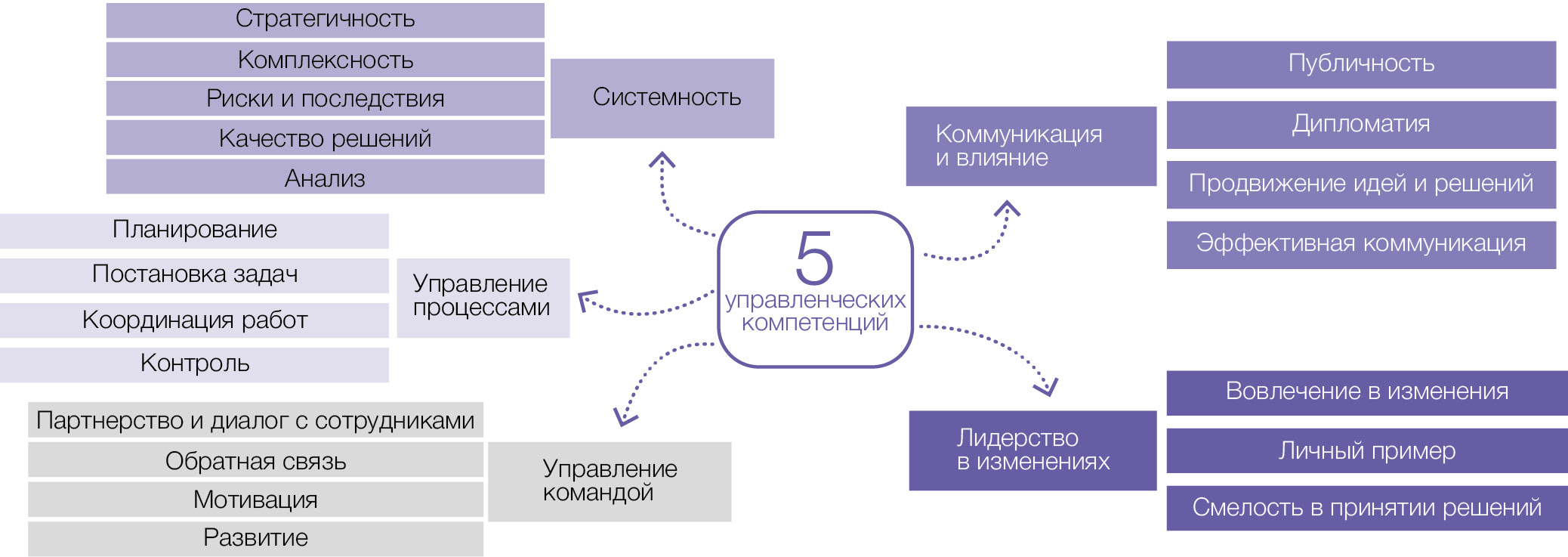 На первом этапе необходимо было сформировать портрет эффективного руководителя Транспортного комплекса. Методом интервью команда проекта выявила перечень компетенций, которыми обладают эффективные руководители всех уровней управления. Далее был сформирован список поведенческих индикаторов1 руководителей высшего, среднего звена и линейных руководителей. Список затем верифицировали путем онлайн-опроса, в котором приняли участие 522 руководителя из 11 организаций – Департамента транспорта и развития дорожно-транспортной инфраструктуры города Москвы, АНО «МДТО», ГБУ «МосТрансПроект», ГКУ «АМПП», ГКУ «ДТЗ», ГКУ «Организатор перевозок», ГКУ «ЦОДД», ГУП «Мосгортранс», ГУП «Московский метрополитен», НКО Фонд «ТИМ», Центра истории и культуры транспорта (филиала АНО «МДТО»). В результате были выявлены и составлены описания пяти основных компетенций, которые легли в основу модели компетенций управленцев Московского транспорта (рис. 1).