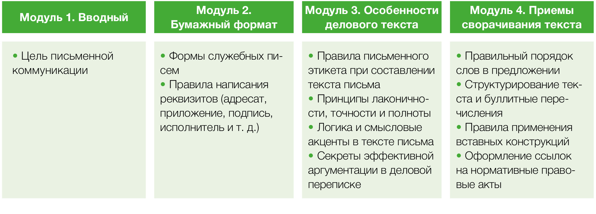 Таким образом, к каждой теме подбирается наиболее действенный с точки зрения усвоения знаний и приобретения навыка набор заданий, упражнений или кейсов. Эффект от практики подкрепляется визуальным опытом – просматриванием многочисленных образцов текстов из реальной переписки государственных органов и организаций.