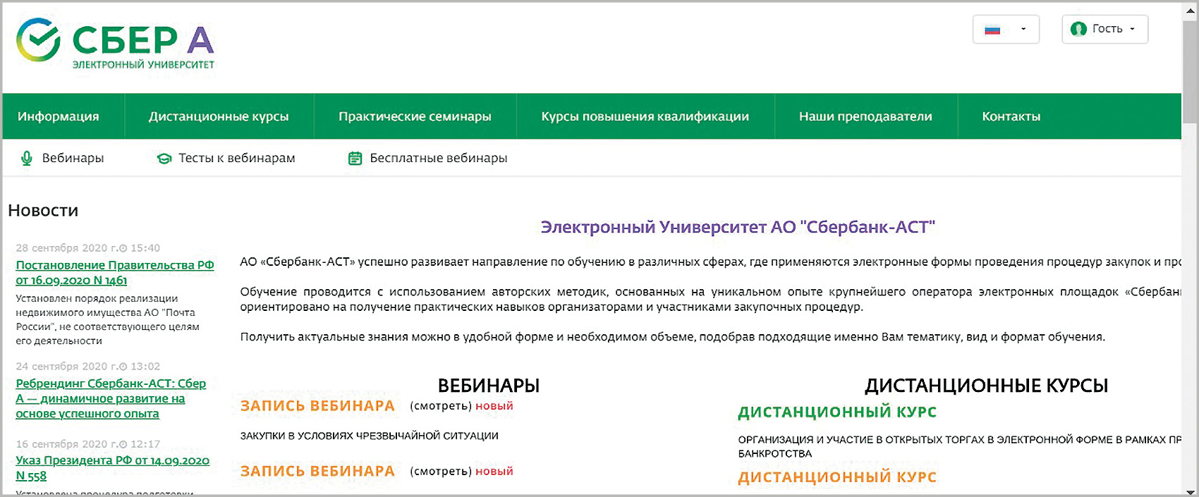 Для повышения эффективности закупок на базе электронной торговой площадки «Сбер А» (АО «Сбербанк – Автоматизированная система торгов») в 2010 г. был создан специальный цифровой образовательный портал – Электронный университет. Портал успешно функционирует, с его помощью реализуются дополнительные профессиональные образовательные программы по организации закупочной деятельности для государственных и муниципальных нужд 1. Программы повышения квалификации и переподготовки университета предназначены для специалистов по управлению и размещению государственных и муниципальных закупок. Занятия проводятся в дистанционной форме, имеют интерактивную составляющую, что позволяет слушателям проходить учебный курс в удобные даты, в комфортном темпе, без отрыва от работы. Благодаря электронному формату обучения возможно оперативно учитывать последние изменения в Федеральном законе о закупках.