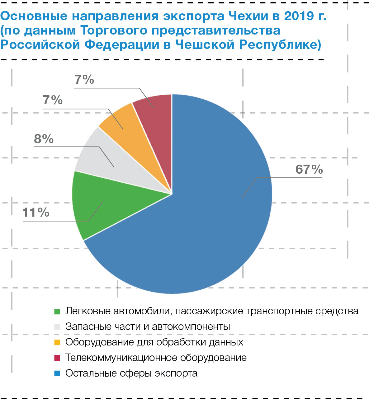 Согласно материалам Министерства промышленности и торговли Чешской Республики, в 2019 г. наибольшая доля чешского экспорта была зафиксирована в поставках легковых автомобилей и пассажирских транспортных средств, запасных частей и автокомпонентов, оборудования для обработки данных и телекоммуникационного оборудования. Эти четыре направления в совокупности составляют примерно треть всего экспорта страны (рис. 1).