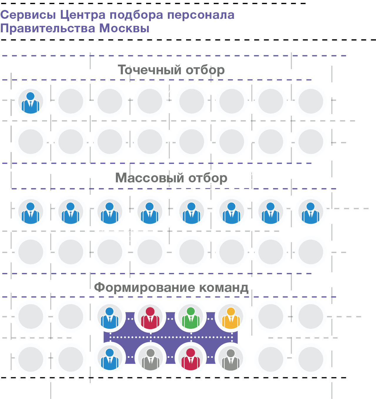 Подбор персонала для работы в структурах Правительства Москвы – одно из ключевых направлений кадрового менеджмента города. Более восьми лет при Аппарате Мэра и Правительства Москвы успешно функционирует Центр подбора персонала, который изначально занимался поиском сотрудников для Аппарата Мэра и Правительства Москвы и подведомственных организаций. В центр обращались и заказчики на этапе комплектования штата при запуске нового проекта. Так, в 2014–2015 гг. была проведена масштабная работа по трудоустройству медицинских работников в рамках проекта «Центр “Содействие”», организованного четырьмя структурами совместно – Департаментом здравоохранения города Москвы, Департаментом труда и занятости населения города Москвы, Управлением госслужбы и кадров Правительства Москвы и Университетом Правительства Москвы. В 2015 г. Центр подбора персонала вместе с Центром кадровой диагностики и развития персонала Университета Правительства Москвы 1 провел открытый конкурс на должности инженеров технадзора и сметчиков для столичного Фонда капитального ремонта многоквартирных домов.