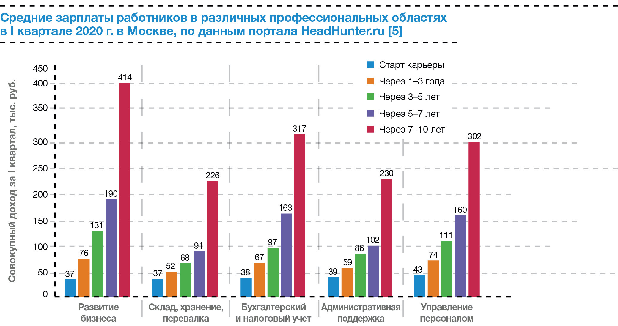 Рис. 1. Средние зарплаты работников в различных профессиональных областях в I квартале 2020 г. в Москве, по данным портала HeadHunter.ru [5]