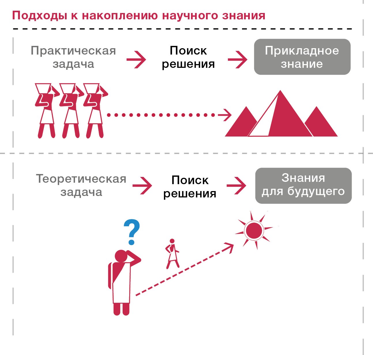 Первый – от практики к теории: здесь научные методы используются для решения конкретных практических задач. Как правильно построить город, как лучше прорыть канал, как защититься от врага, как эффективно организовать торговлю – это задачи практики, которые возникали с древних времен и до сих пор являются актуальными. Есть и другой подход: ученые, в основном философы, издавна решали научные, в том числе и абстрактные задачи, например, в геометрии или диоптрике, изобретая таким образом новый научный аппарат. Практическое применение результатов этих исследований могло начинаться существенно позже – спустя годы, десятилетия или даже века. Так зарождалась фундаментальная наука, которая по своей сути является наукой будущего. Разрабатываемые ею модели и методы мы подчас не можем использовать в настоящем, но завтра они получают свое воплощение на практике. Оба названных подхода способствуют поиску и выработке оптимальных решений. Второй подход к развитию знания не менее важен, чем первый, поскольку в ходе абстрактно-прикладного наблюдения за природой мы получаем информацию, которая нужна для решения практических задач. В качестве исторических примеров можно привести задачу Дидоны или принципы Герона и П. Ферма. Каждый из них имел прикладное значение [2, 7].