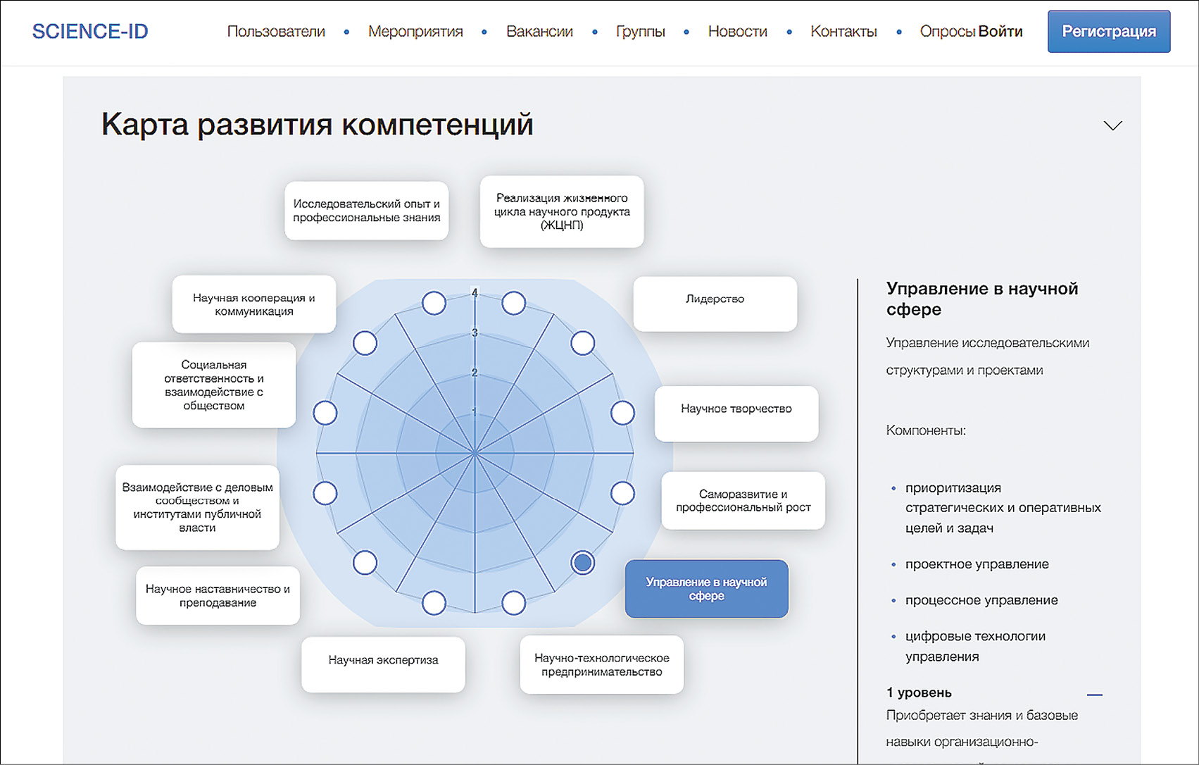 Рис. 1. Интерактивная карта развития компетенций, необходимых для успешной профессиональной самореализации в науке (фрагмент страницы веб-сайта Science-ID)