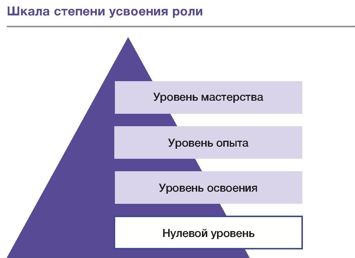 Для оценки усвоения роли разработана своя шкала, однако она представляет собой не балльную оценку, а уровневую (рис. 1). Для каждого уровня составлено описание, позволяющее учитывать как профессиональный статус сотрудника, так и его знания, умения, навыки и мотивацию.