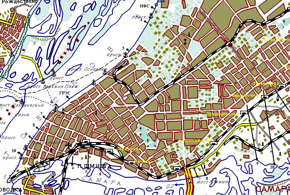 Выпуски сточных вод в Саратовское вдхр.: 6 – Ульяновский; 7 – Вилоновский; 8 – Некрасовский; 9 – Ленинградский; 10 – Комсомольский. Выпуски сточных вод в р. Самару: 1 – Хлебная площадь; 2 – Крупский; 3 – Судоремонтный завод; 4 – Горячий ключ; 5 – Деповский