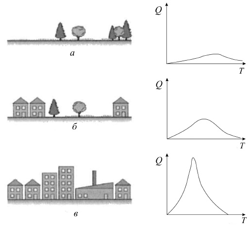 Рис. 2. Гидрограф поверхностного стока c различных водосборных территорий [8]: а – естественная среда; б – небольшие города; в – крупные города