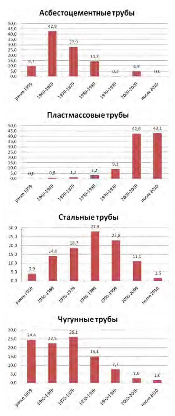 Вывод. Установленное распределение трубопроводов водопроводных сетей по материалам труб для населенных пунктов с разным числом жителей показало, что наибольшую протяженность имеют стальные и чугунные трубопроводы. За последние 25 лет в России наибольшее распространение получили пластмассовые трубы. На их долю после 2010 г. приходится 86,5 % вновь построенных водопроводных сетей без учета данных по Москве и Санкт-Петербургу. Приведенная информация о фактических сроках службы трубопроводов из различных материалов свидетельствует, что в целом по всем населенным пунктам превышен нормативный срок службы для 40,8 % водопроводных сетей.