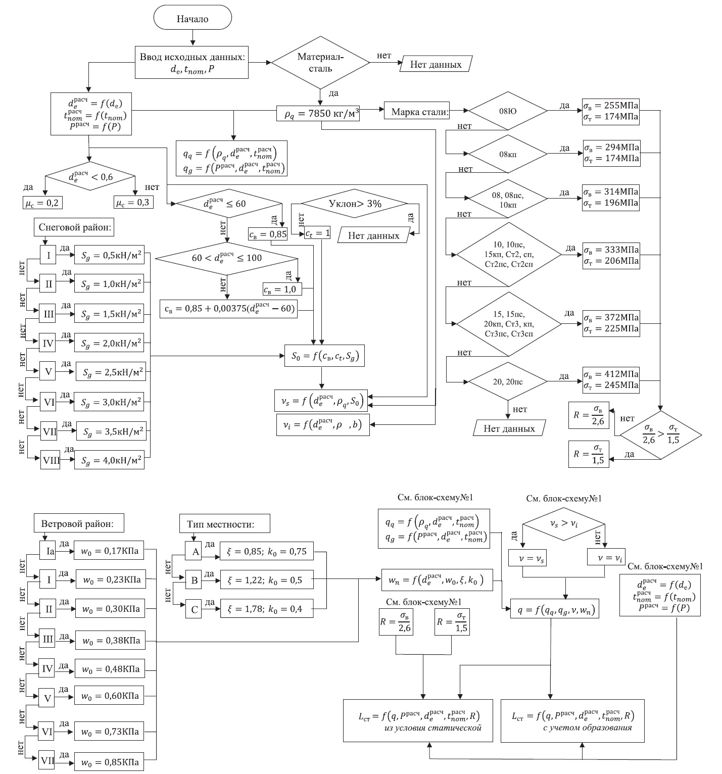 Последовательность расчетов определяется логической цепочкой, учитывающей исходные проектные данные (рабочее давление в газопроводе, материал, диаметр, толщину стенки, климатический район строительства и т. д.) Для схематического представления алгоритма расчета величин средних пролетов между опорами надземных газопроводов для различных климатических условий составлена блок-схема, которая затем была применена в электронных таблицах Microsoft Excel.