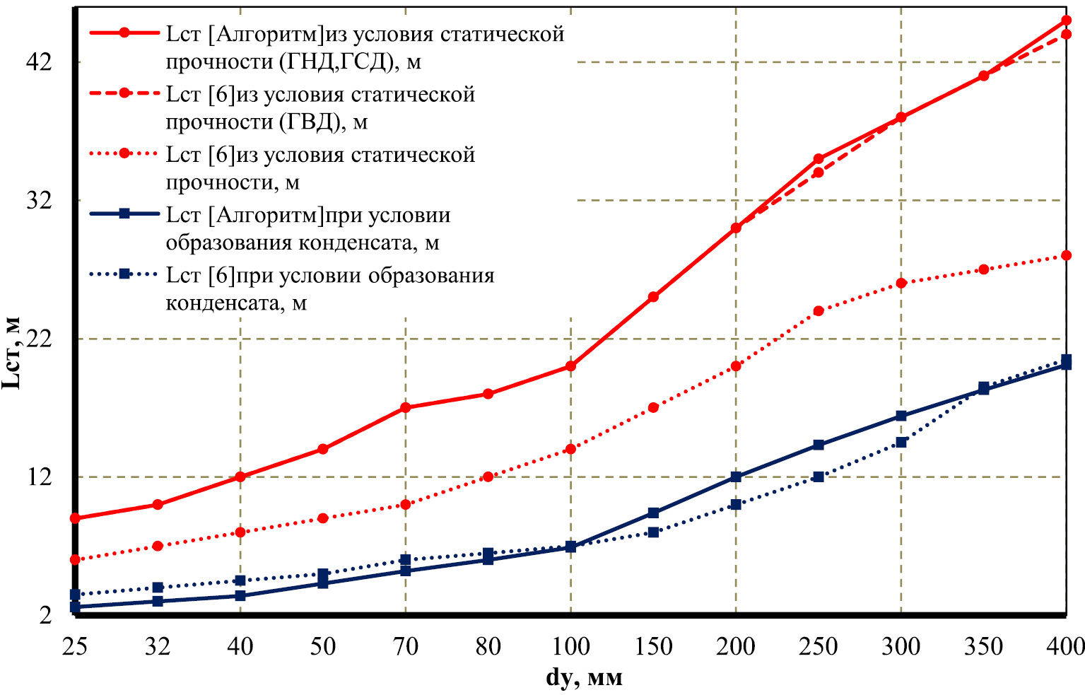 Использование усредненных нормативно-технических сведений при выполнении инженерных вычислений приводит к игнорированию ряда существенных факторов, влияющих как на статическую прочность и устойчивость, так и на стоимостную характеристику линейных участков надземной газовой сети. Проведено сравнение значений межосевых расстояний надземного стального газопровода низкого и среднего (высокого) давлений для диапазона dy = 25 ÷ 400 мм, полученных с помощью предложенного алгоритма, со справочными данными [7], используемыми при выполнении инженерных расчетов. Визуализация результатов представлена на рис. 4 и 5.