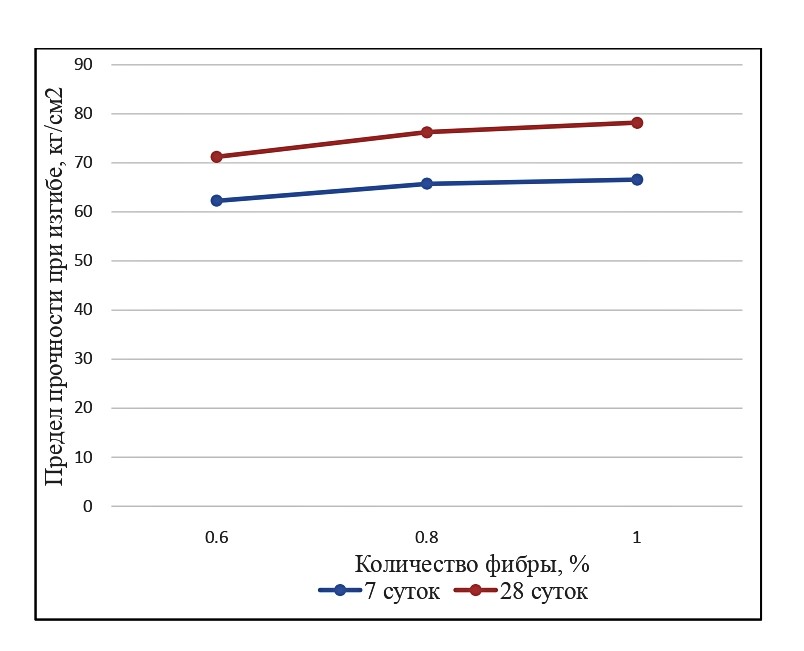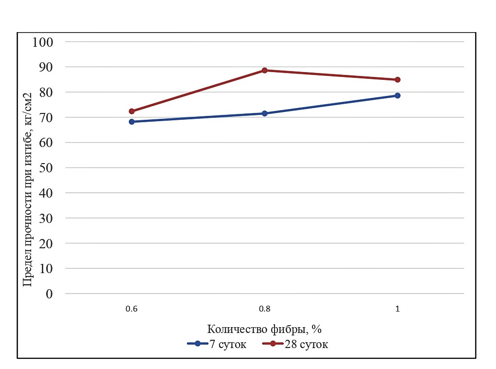Анализ результатов испытаний второй серии образцов показывает, что с увеличением количества фибры до 0,8 % от массы бетонной смеси прочность при изгибе начинает возрастать на 16,32 % по сравнению с образцами с процентом армирования, равным 0,6 % от массы бетонной смеси. После увеличения процента фибры до 1 % показатель прочности при изгибе снизился на 4,2 % по сравнению с образцами с показателем армирования 0,8 %. Наилучшие прочностные характеристики в возрасте 28 сут имеют образцы мелкозернистого бетона с стеклофиброармированием, равным 0,8 % от массы бетонной смеси. Таким образом, стеклофибробетон имеет лучшие показатели прочности при изгибе, а именно они выше на 13,3 % по сравнению с контрольными образцами.