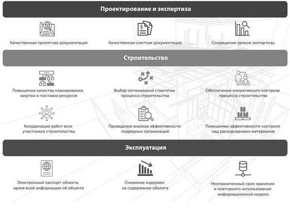 На рис. 1 показаны преимущества применения BIM на стадиях проектирования, экспертизы, строительства и эксплуатации.