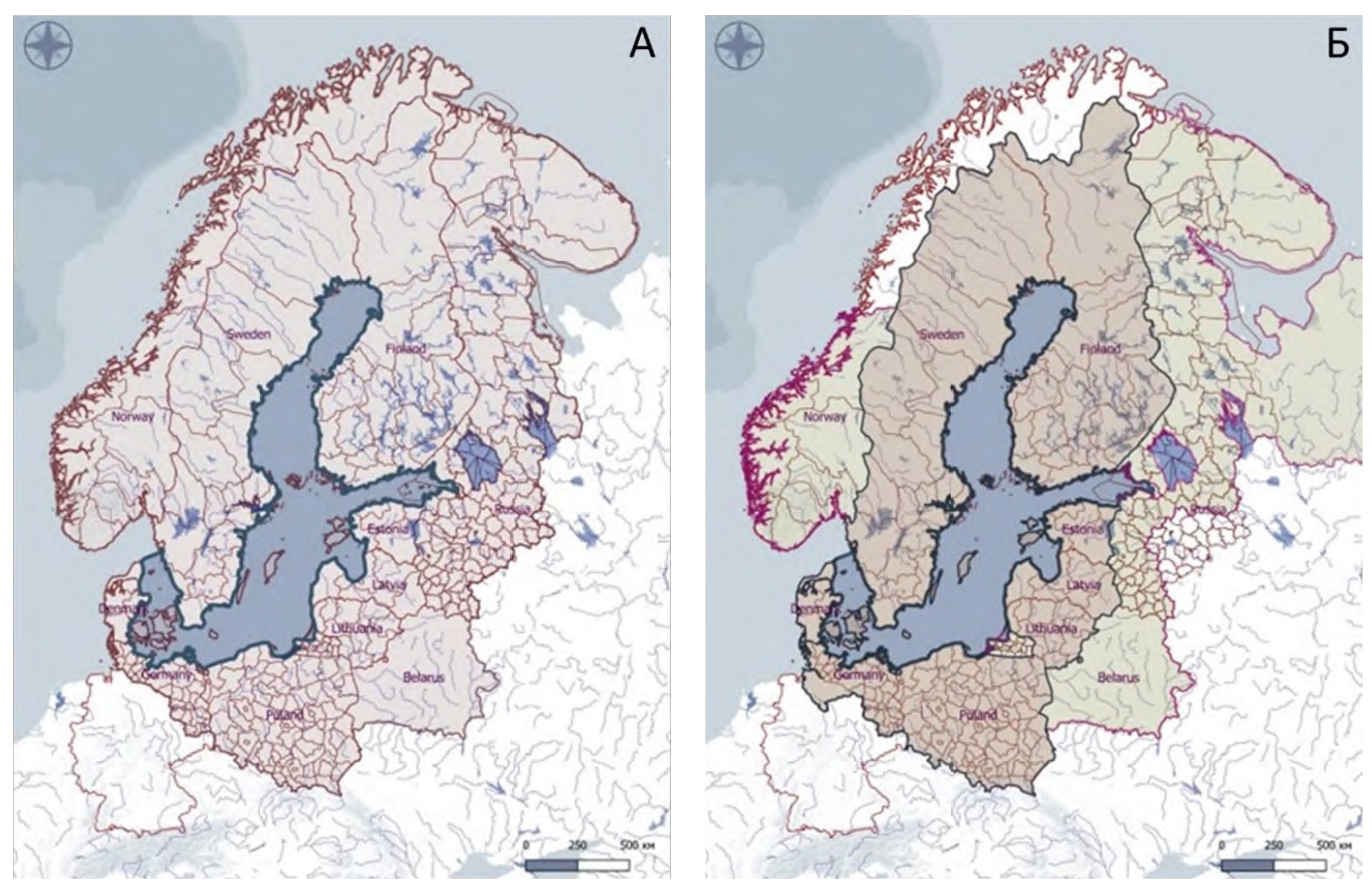 Рис. 10. Делимитация Балтийского региона на основе программно-стратегического подхода: А − границы действия программы «Видение и стратегии вокруг региона Балтийского моря» (VASAB – Vision and strategies around the Baltic Sea,1992-н.в.); Б − границы действия программ «INTERREG для региона Балтийского моря» (Interreg Baltic Sea Region, 2014-н.в.) и «Стратегии Европейского Союза для региона Балтийского моря» (European Union Strategy for the Baltic Sea, 2009)