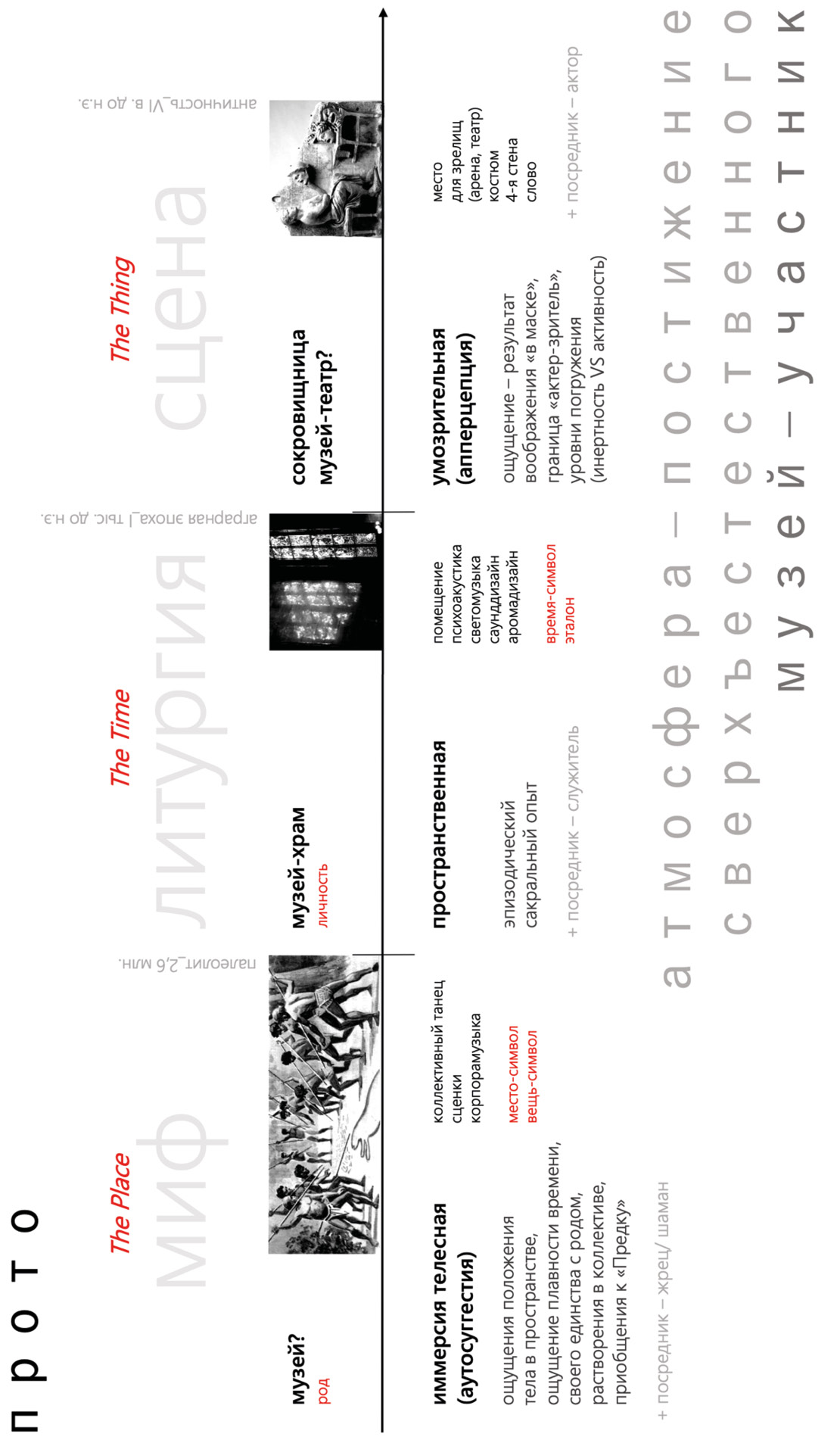 В данном разделе эти формулы пространственно-чувственного опыта рассмотрены на примере протомузейных практик: от мифоритуального действа первобытности к первым литургическим, сценическим экспериментам Древнего мира.