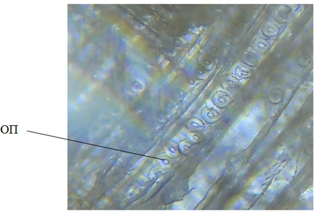 Наличие однорядного расположения окаймленных пор (ОП) трахеид (рис. 3) свидетельствует о том, что исследуемый образец может быть отнесен к хвойным породам древесины − сосна или ель.