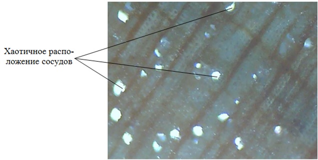 Кроме определения различий хвойных пород, микрометрическое исследование позволяет определить, к какому типу лиственных пород относится исследуемый образец. Так, в качестве примера можно оценить срез березы с ее рассеянно-сосудистой структурой (рис. 5).