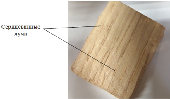 Макроструктурный анализ также позволяет определить породу использованной в конструкции древесины, примером может служить проба, отобранная из опорной стойки рамы мельницы (рис. 6). Её изучение свидетельствует о том, что данная конструкция выполнена из древесины дуба, что подтверждается наличием четко выраженных сердцевидных лучей (рис. 7), сосудов, расположенных вдоль годичных колец (кольцесосудистая древесина) (рис. 8), а также характерным кислым запахом при обработке.