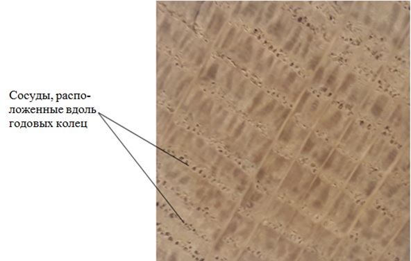 Двухрядное расположение окаймленных пор трахеид означает, что образец отобран из изделия, выполненного из лиственницы (рис. 4).