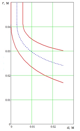 На рис. 2 приводится результат профилирования РК в меридиональном сечении. Здесь показано положение внутреннего обвода, внешнего обвода (корпус РК) и положение среднего сечения потока.