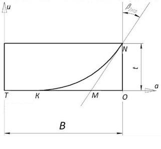 Как и при построении меридиональных обводов РК для формирования кривой Безье использовались три опорные точки (см. рис. 3): точка начала кривой К, лежащая на осевой линии, точка N и точка М пересечения осевой линии и прямой, проведенной через точку N под углом β2 от окружной координаты u. Алгоритм построения кривой аналогичен приведенному выше. Положение средней линии профиля лопасти РК в u−r координатах приведено на рис. 4. Здесь u – окружная координата, в пределе равная шагу между лопатками в контрольном сечении D2cp, r – координата радиуса турбины.