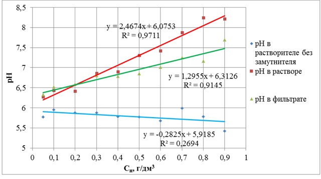 Графическое представление зависимостей pH = f(Cн) указывает (коэффициентами парной корреляции R2) на очень сильную связь по шкале Чеккода (табл. 3) между значениями рН и Cн в растворе и фильтрате, где в качестве растворителя использовался дистиллят (рис. 2) и практическое отсутствие или слабую связь между этими величинами в аналогичных опытах с водой ГВС (рис. 3).