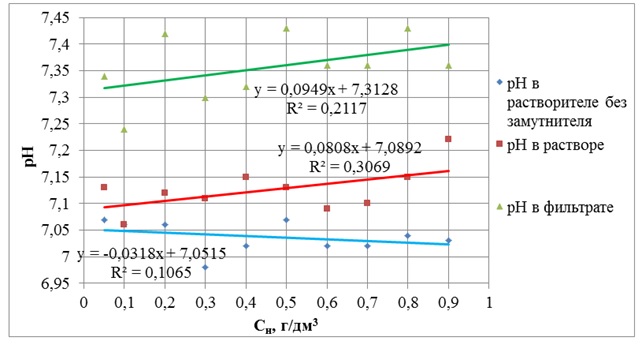 Было установлено (см. рис. 2 и 3), что в исследуемом диапазоне изменения параметров значения pH находились в прямо пропорциональной зависимости от увеличения концентрации замутнителя Cн. Причем интенсивность роста значения pH (JpH)на единицу увеличения концентрации замутнителя Cн составляла, ед. pH/(г/дм3):