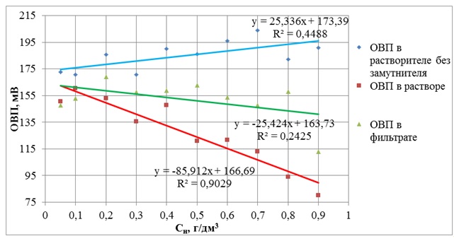 Из анализа данных, приведенных на рис. 4 и 5, было установлено, что в исследуемом диапазоне изменения параметров значения ОВП находились в обратно пропорциональной зависимости от увеличения концентрации замутнителя Cн. Причем интенсивность снижения значения ОВП(JОВП) на единицу увеличения концентрации замутнителя Cн составляла, мВ/(г/дм3):