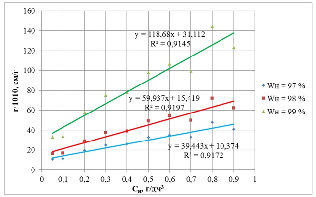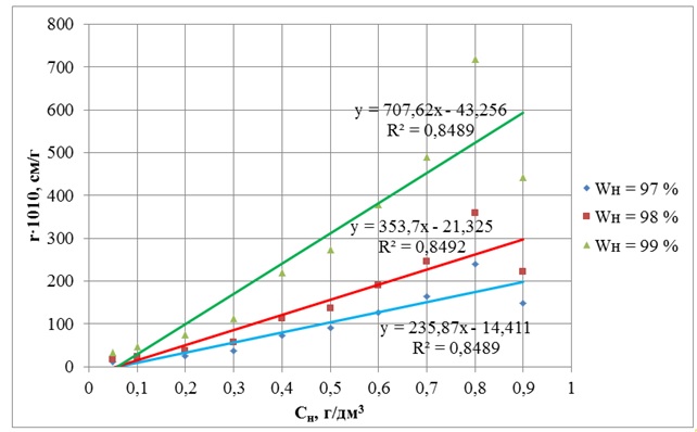Сравнительный анализ данных, представленных в табл. 7 и на рис. 7, 8, указывает на прямо пропорциональную линейную зависимость удельного сопротивления исследуемого осадка r как от концентрации замутнителя Cн, г/дм3, так и от начальной влажности осадка Wн, %, в обоих растворителях. Причем интенсивность прироста значения r (Jr) на единицу увеличения концентрации замутнителя Cн составляла, дм4/г2: