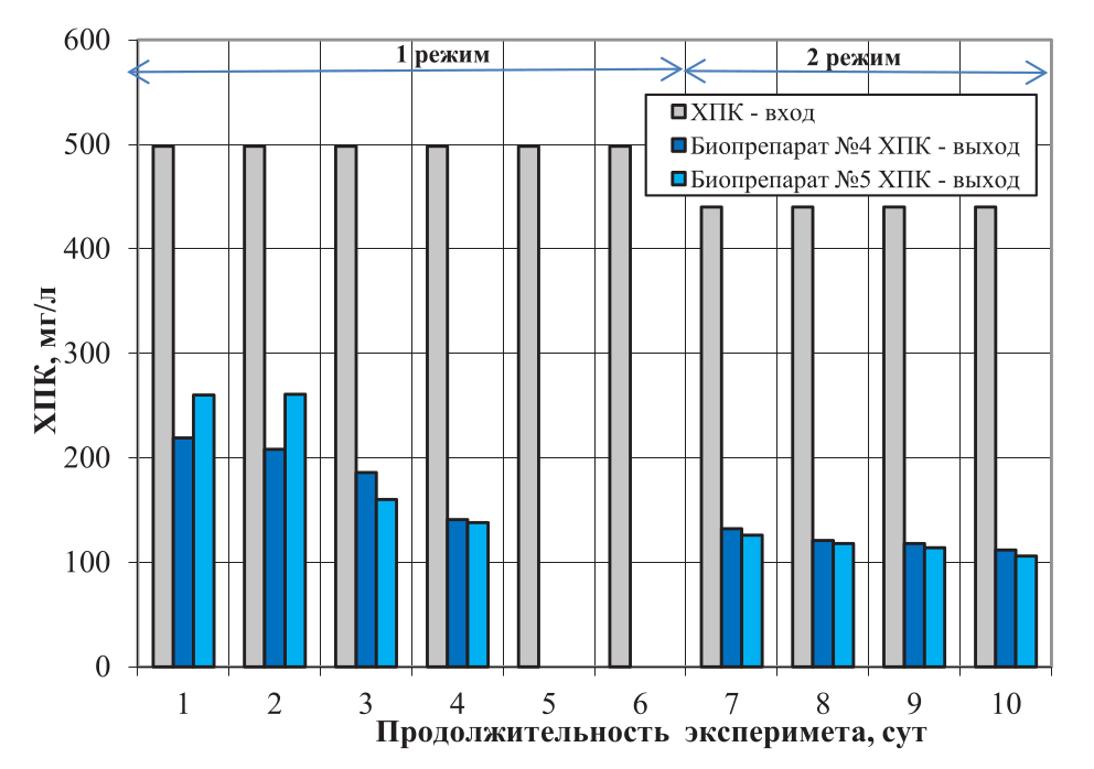 Эксперимент был проведен в лабораторном реакторе периодического действия (SBR) на сточных водах ООО «БоМЭЗ» с. Богатое при температуре сточных вод 23−25 °С и концентрации растворенного кислорода в реакторе 5−7 мг/л. Первый режим − время пребывания 4,79 сут, расход 1 л/сут; второй режим − 3,21 сут, расход 1,5 л/сут. Концентрация органических загрязнений исходной воды по ХПК в течение эксперимента изменялась от 498 до 440 мг/л. На первом режиме работы установки ХПК очищенной воды составляла в среднем для биопрепарата № 4 – 177 мг/л и для биопрепарата № 5 – 189 мг/л. На втором режиме в среднем получено ХПК очищенной воды для биопрепарата № 4 – 117 мг/л и для биопрепарата № 5 – 113 мг/л (рис. 1).