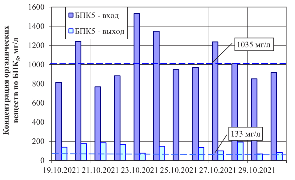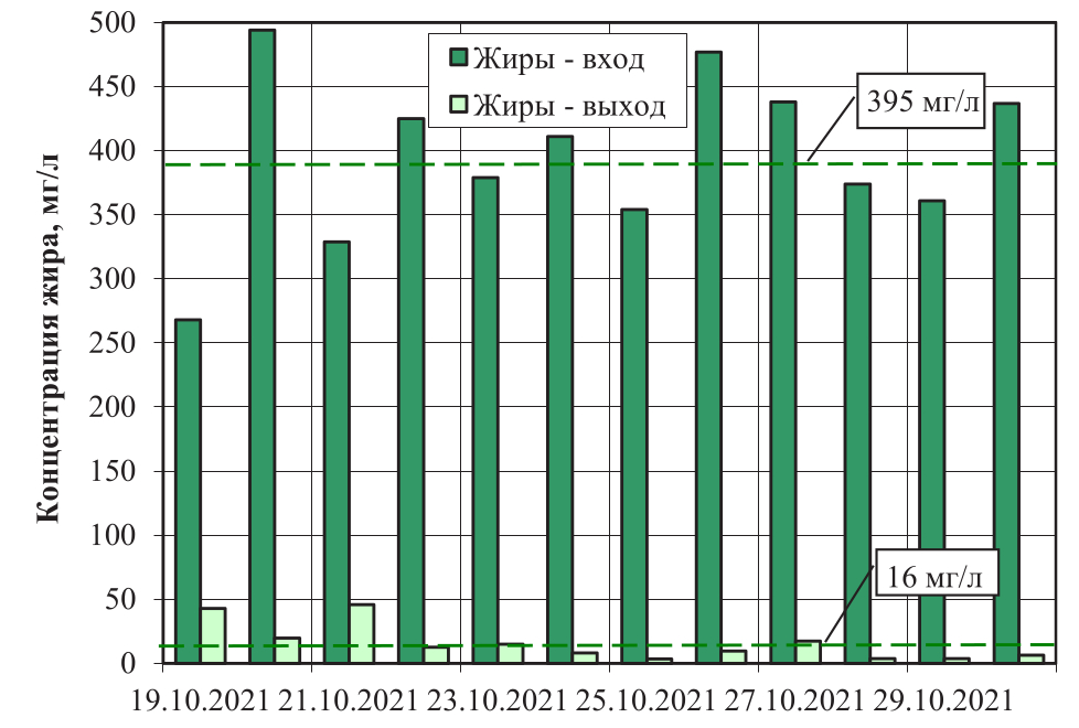 Средняя эффективность очистки органических веществ по ХПК при применении биопрепарата № 4 составила: 1-й режим – 64 %, 2-й режим – 73 %. При применении биопрепарата № 5: 1-й режим – 61 %, 2-й режим – 74 %. Эффективность очистки по жирам составила 100 % при концентрации жира в исходной сточной воде 14 мг/л.
