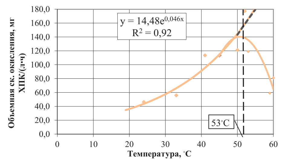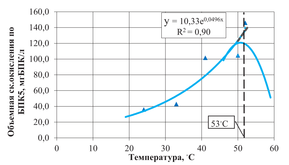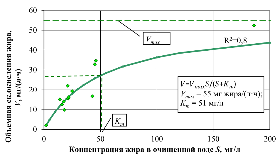 Результаты пилотного эксперимента позволили определить объемные скорости окисления диктующих компонентов (жиры, БПК5, ХПК) от их концентрации в очищенной воде. С помощью полученных температурных констант эти значения были приведены к температуре 40 °С (принята за стандартную).