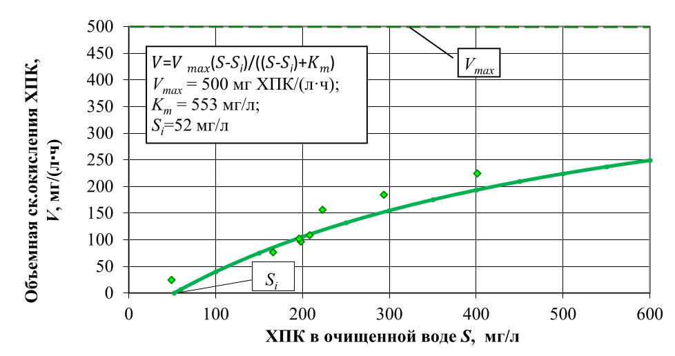 Применив полученные в ходе эксперимента константы, объемная скорость окисления органических веществ V с учетом влияния температуры, при конкретном качестве очистки воды, определяется по формулам: