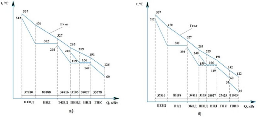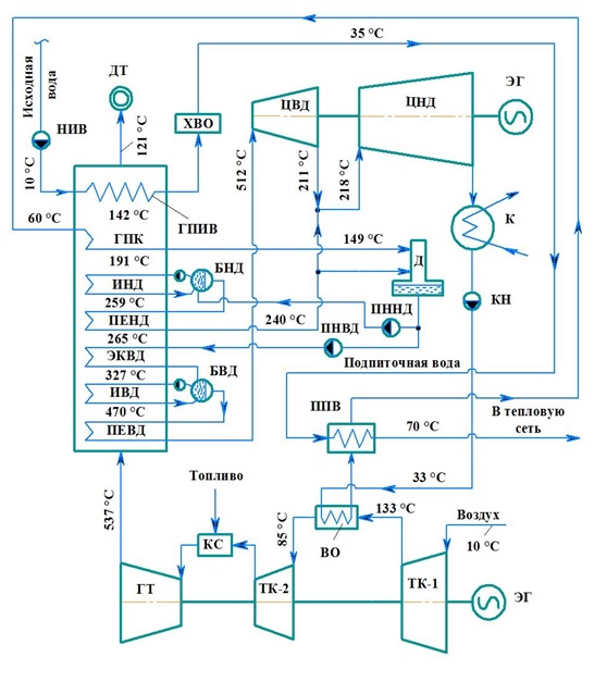 Тепловой расчет был проведен при следующих исходных данных: КПД и мощность ГТУ ηГТУ = 34,4 %, NГТУ = 157 МВт; начальная и конечная температура газов = 1125 °С и = 537 °С; расходы циклового воздуха и газов GB = 500 кг/с и GГ = 509 кг/с; давления перегретого пара высокого и низкого давления = 8,0 МПа и = 0,65 МПа; исходная степень повышения давления воздуха в турбокомпрессоре ГТУ β = 11,3; внутренний относительный КПД турбокомпрессора и газовой турбины ГТУη0i = 0,85; электромеханический КПД турбины ηЭМ = 0,975; давление в конденсаторе турбины рk = 5 кПа; давление в деаэраторе рД = 0,6 МПа; показатель адиабаты воздуха k = 1,4; величины температурных напоров на горячей и холодной стороне поверхностей нагрева КУ δt = 25 °С и недогрева до температуры насыщения ∆t = 10 °С. Приняты величины степени повышения давления воздуха в ТК-1 и ТК-2 β1 = 3 и β2 = 4. Тепловой расчет выполнен для работы ПГУ в конденсационном режиме при температуре наружного воздуха tНВ = +10 °С.