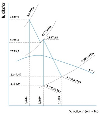 После ЦВД турбины отработавший пар смешивается с потоком перегретого пара низких параметров и образовавшаяся паровая смесь с расходом DЦНД = 2 · ( + ) и энтальпией