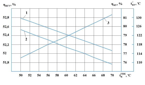 - Расчетным путем получены графические зависимости КПД котла-утилизатора и парогазовой установки от температуры конденсата на входе в ГПК. Установлено, что снижение температуры конденсата с 70 до 50 °С приводит к уменьшению температуры уходящих газов с 131,5 до 112 °С и, как следствие, к повышению КПД котла-утилизатора и парогазовой установки. Результаты проведенных исследований подтверждают эффективность использования турбинного конденсата для промежуточного охлаждения сжатого в турбокомпрессоре низкого давления циклового воздуха.