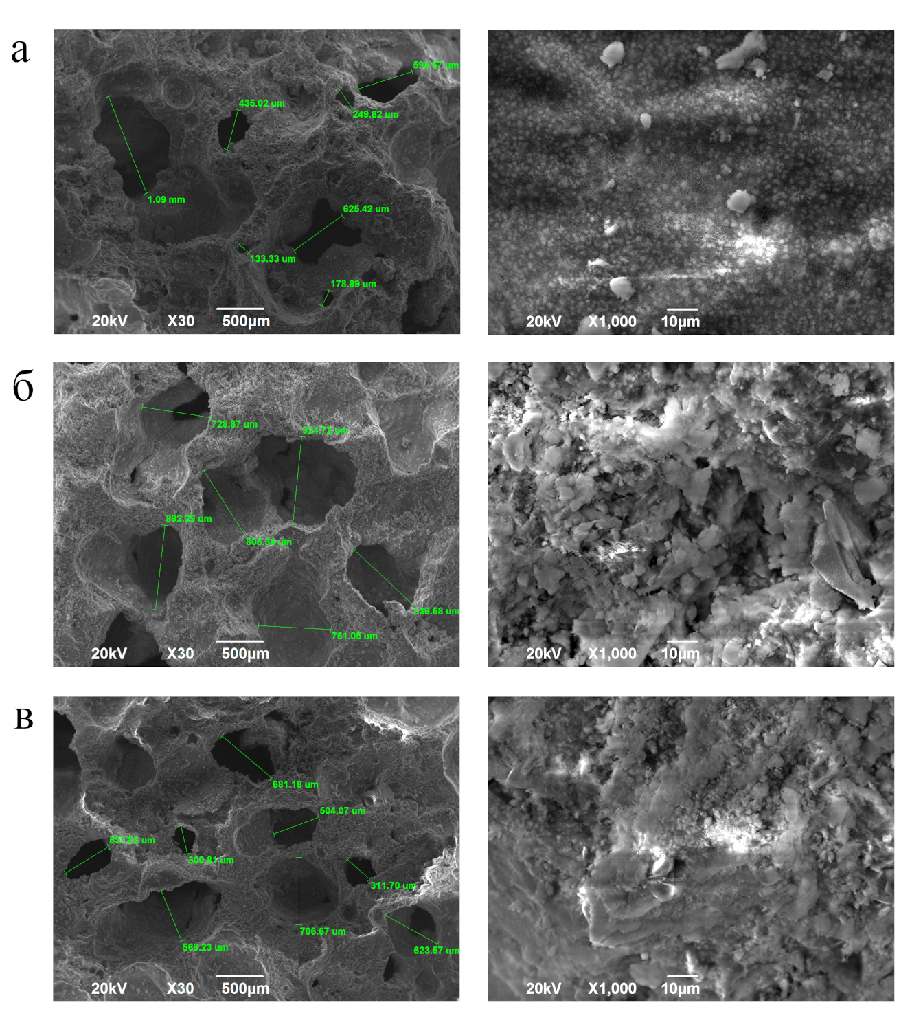 Средний размер макропор, определенный по снимкам с увеличением в 30 раз, составляет около 650-1000 мкм, а равномерность пористой структуры сходна во всех трех образцах. При увеличении в 1000 раз на образце I, взятом с поверхности массива, заметна характерная кристаллическая структура с явно выраженными центрами кристаллизации. В образцах II и III кристаллическая структура выражена неявно, однако соответствует данным, опубликованным в работах [3, 6].