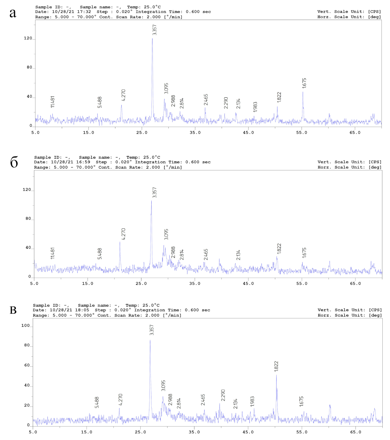 На представленных дифрактограммах указаны характерные пики в 1,82-1,86 Á, 11,3-11,4 Á, и 2,8 Á, 3,07-3,08 Á, принадлежащие тоберморитовой и ксонотлитновой фазам соответственно [5, 6]. Наиболее выраженный пик в 3,357 Á принадлежит кварцу, а небольшой пик 5,47-5,5 Á – гидроалюминатным соединениям. Пик 4.27 Á может соответствовать как кварцу, так и ксонотлиту [6].