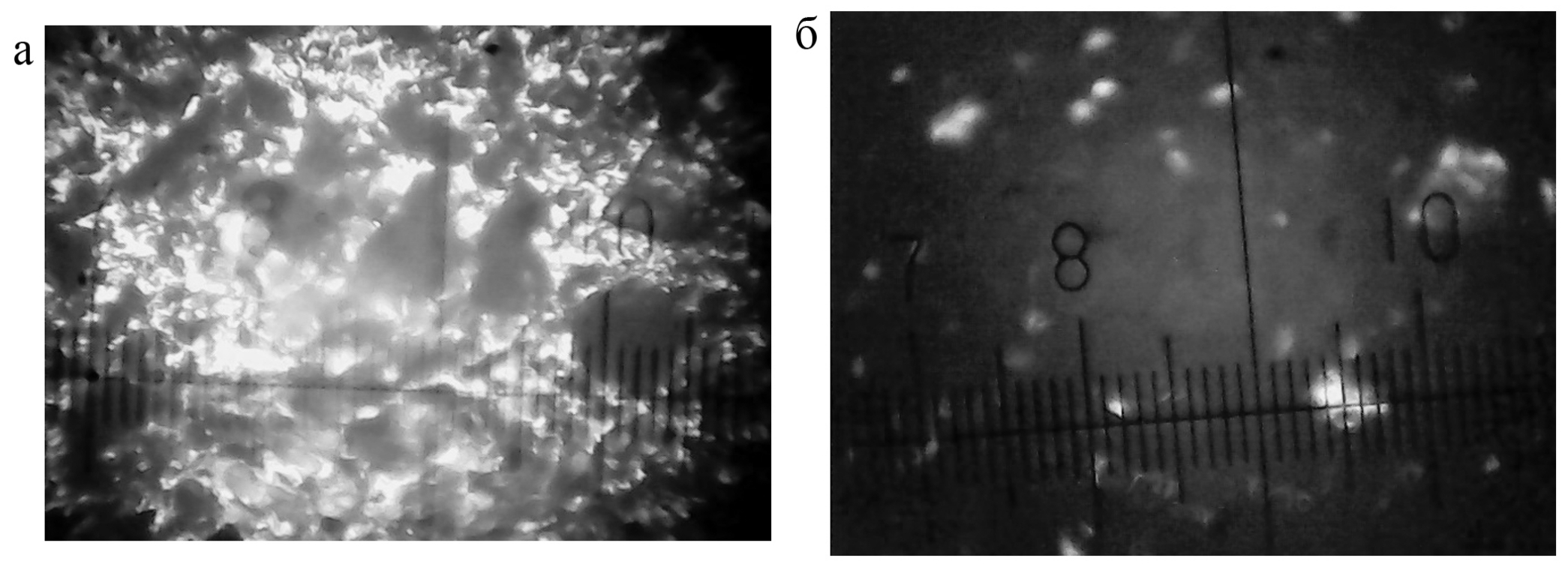 Микроскопические исследования выполнены на поляризационном микроскопе МИН-8 с рабочим увеличением 25-56 крат на предварительно подготовленных образцах в виде плоских сколов и порошковых препаратов, путем их растирания в фарфоровой ступке. Метод заключается в подсчете количества кристаллов и стекломассы. В проходящем свете микроскопа все зерна подготовленной пробы имеют серый цвет. При включенных анализаторе и поляризаторе (в скрещенных николях) просвечивают кристаллические образования, а стекломасса становится черной (рис. 3). При подсчете зерен кристаллические образования составляют около 8-10 % от общего объема исследуемого препарата, причем минимальная величина содержания кристаллической фазы соответствует образцу, отобранному из зоны массива ячеистого бетона, имеющего описанное ранее потемнение. Полученные результаты не противоречат известным данным.