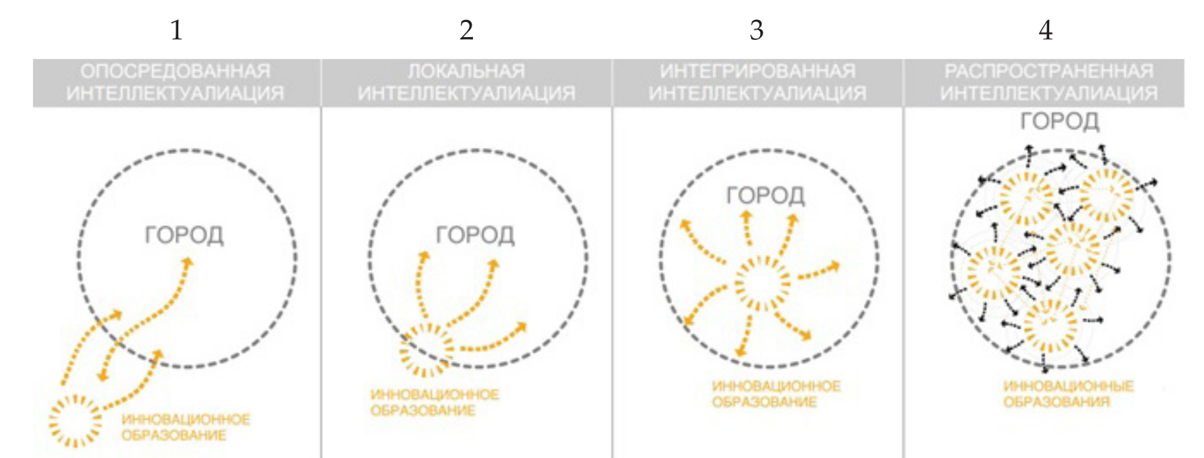 3) интегрированная интеллектуализация, когда ИНГСО интегрирован в городскую среду и представлен целым рядом объектов, формирующих сразу несколько взаимосвязанных очагов внедрения инноватики, например на платформе вузов, каких-либо предприятий и т. п.;