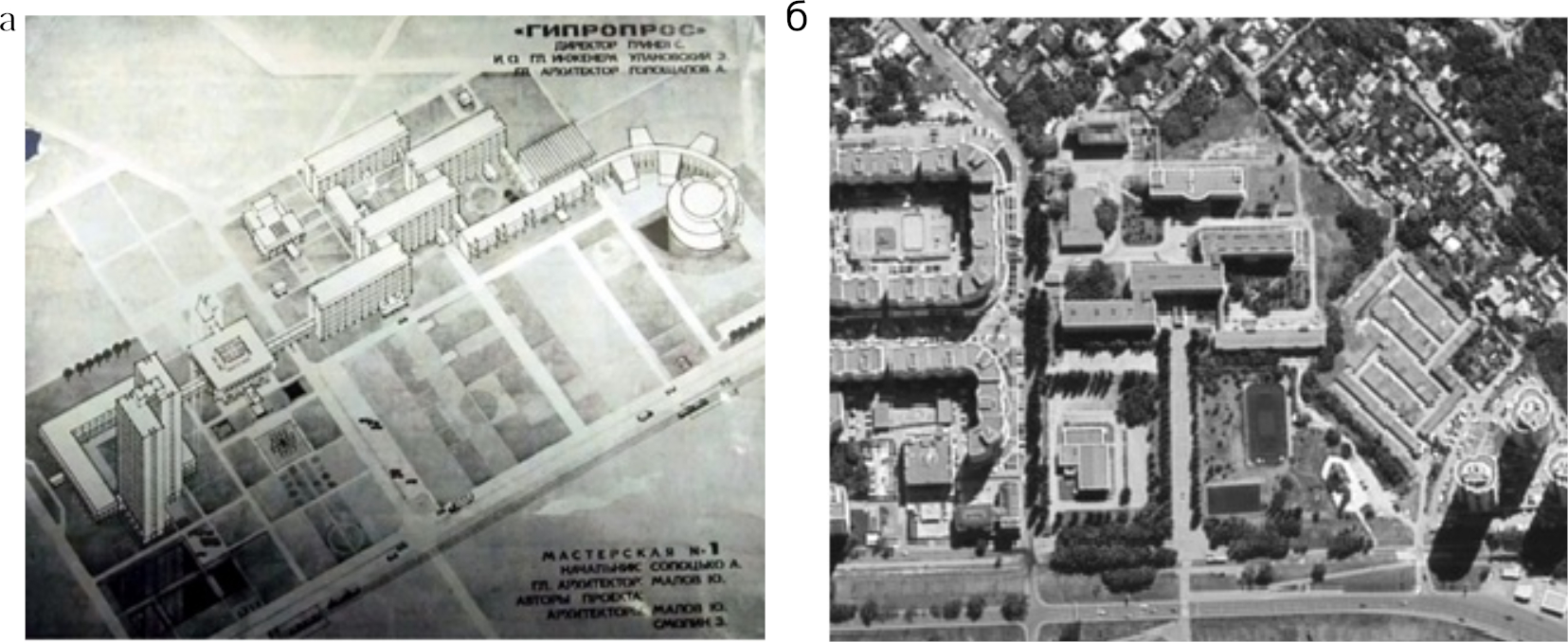 Рис. 1. Комплекс зданий бывшего Самарского государственного университета: а – проект комплекса [10]; б – существующая градостроительная ситуация