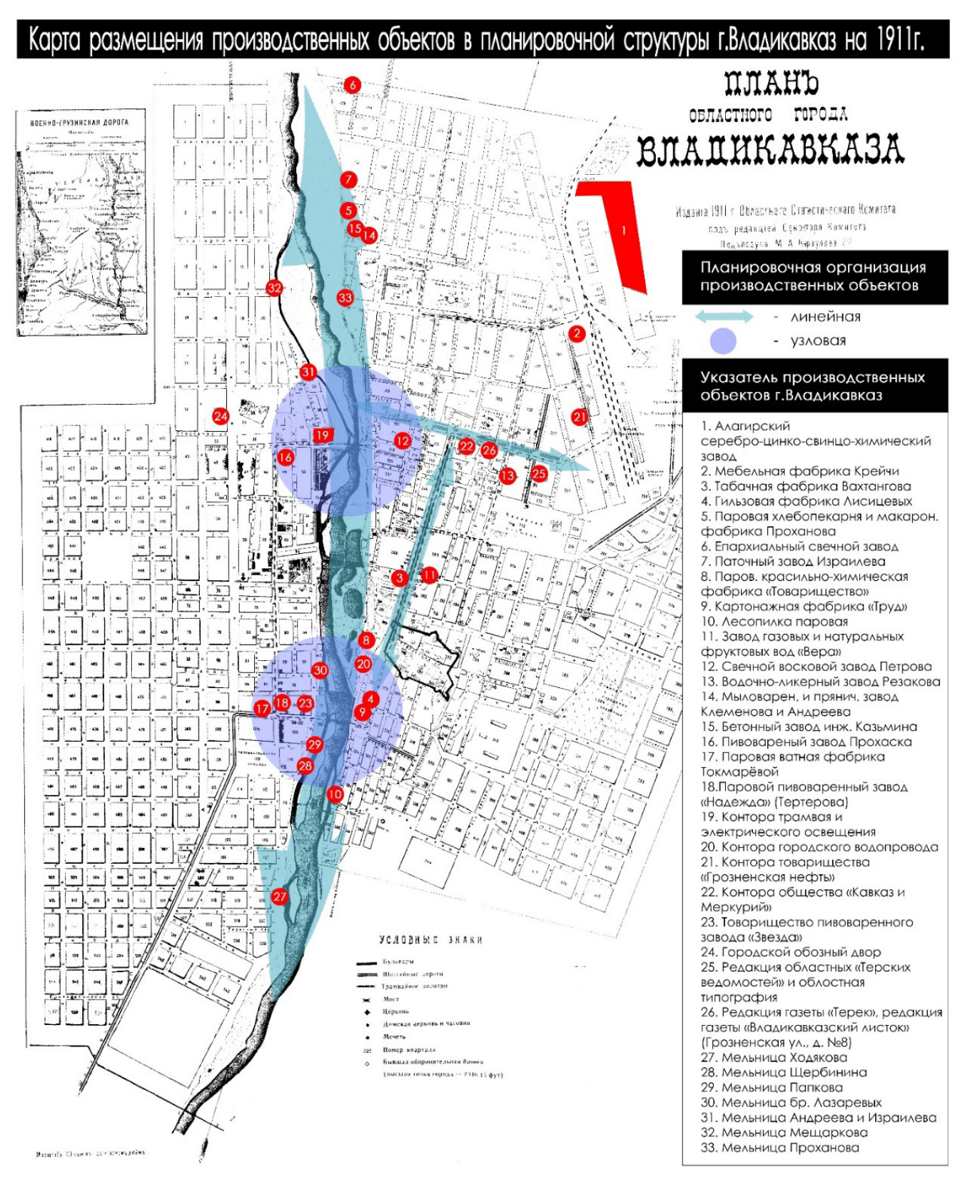 Градостроительные особенности и закономерности размещения промышленных предприятий в планировочной структуре Владикавказа. На основе архивных данных и картографического анализа были выявлены объекты производств Владикавказа на 1911 г. (см. рисунок). Всего на территории города насчитывалось 33 объекта. Выявлено размещение этих объектов в планировочной структуре город