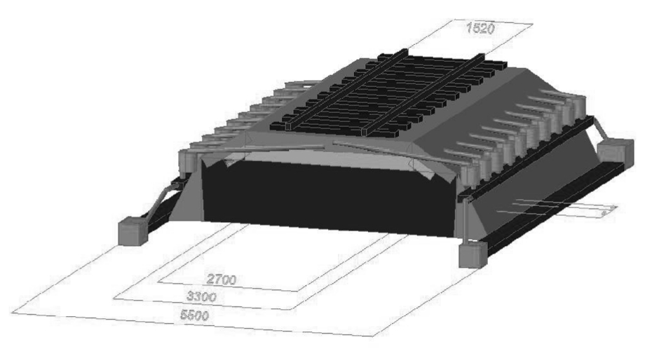 1 этап – на экспериментальном участке железнодорожного пути. Были проведены исследования на чистом экспериментальном участке балластной призмы железнодорожного пути для исключения мешающих условий и случайных загрязнений [1]. Было осуществлено новое строительство экспериментального участка железнодорожного пути с полотном длиной 3,5, шириной 5,5 м согласно нормативным документам и стандартам [9−14]. Для установки были использованы стандартные железнодорожные рельсы марки Р45 [12, 14, 15]. Межшпальное пространство составляло 543 мм согласно [13, 14] (рис. 3, 4).